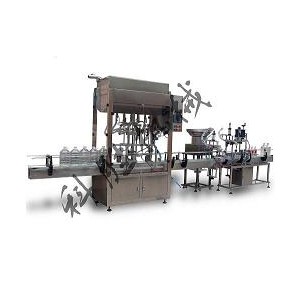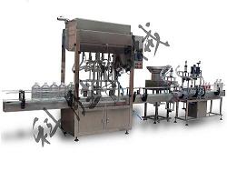 旋轉(zhuǎn)式灌裝機(jī) + 送瓶輸送帶 + TRJ-901CR立式貼標(biāo)機(jī) + XG2004自動(dòng)旋蓋機(jī) + 送瓶機(jī)