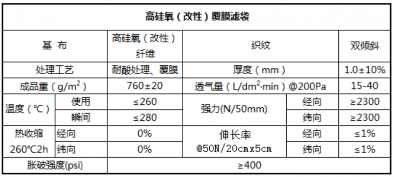 高硅氧(改性)覆膜濾袋可以在酸露點以上到260℃之間連續運行,瞬間耐溫達280℃,對于瞬間產生的灼熱顆粒、火星,濾料不會出現灼傷、燃燒現象。耐酸高硅氧覆膜濾料在280℃烘箱內烘烤2小時,理化指標和顏色基本不變,這是其它濾料所不具備的。