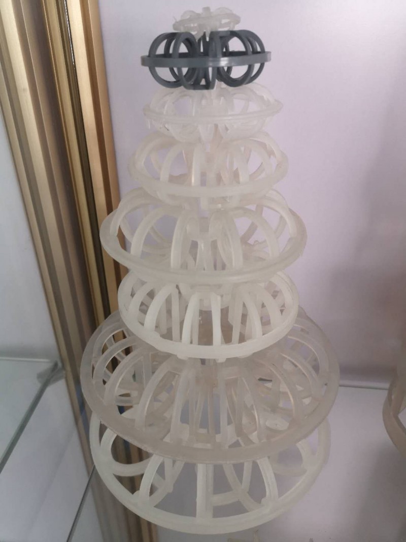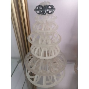 泰勒花環填料是由美國Teller.A.j.1954年介紹的一種填料,國內通稱泰勒花,是由12個小圓環按徑向排列而組成的一個大扁球體,很類似于一個螺旋形彈簧首尾相接繞成的一個圓球休,現已成為系列化產品,共有三個型號。這種填料的主要特點是填料的空隙率大,不易被堵塞,還有通量大、阻力小等優點,由于這種填料的間隙處能有較高的滯液量,可使塔內液體停留時間較長,從而增加了氣液的接觸時間,提高了優質效率。用戶可根據塔內使用條件(如溫度、壓力、介質等)選擇不同材質如聚丙烯(PP)、RPP(玻璃增強聚丙烯)、聚氯乙烯(PVC)、氯化聚氯乙烯(CPVC)、聚偏氟乙烯(PVDF)等塑料花環填料。