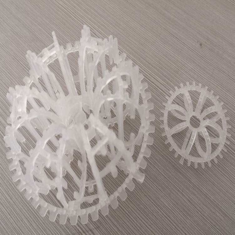 塑料帶刺花環填料主要特點:空隙率大,不易被堵塞,通量大、阻力小等優點,且間隙處有較多的滯液量,使塔內液體停留時間較長,增加了氣液接觸時間,提高效率明顯。