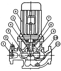 IRG型結構說明: 1.泵體與上部結構中間裝有隔熱蓋,適用于介質溫度T〈120度的場合。 2.泵與電機軸承組合裝置,保證軸運轉精度,提高了密封的可靠性。 3.可根據用戶要求隔熱蓋內安裝風冷裝置。 |