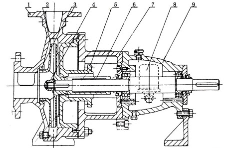 1-泵體 2-葉輪 3-密封環(huán) 4-葉輪螺母 5-泵蓋 6-密封部件 7-中間支架 8-軸 9-懸架部件