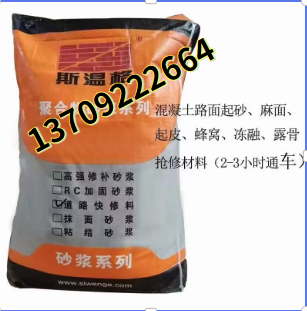 道路修補料以水泥為基礎結合劑,高強度材料(石英砂)作為主骨料,輔以高分子膠粉、---減水劑、早強劑、膨脹劑、防離析等物質配制而成的超早強型混凝土結構修補材料。本產品具有自流性好,快硬、早強、高強、無收縮、微膨脹;