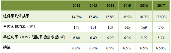 圖表:2012-2017年國內(nèi)太陽能背板需求統(tǒng)計(jì)分析(單位:W,m2/kw,GW,萬m2)