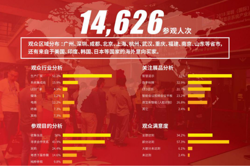 2018年展會共有150家展商參與,長虹、皓麗、鴻合、視源仙視、惠科、信頤、迅豹、康冠商用、中新科技、TCL商用、華星光電、視美泰、合力泰、云智匯、中電盈科、品觸光電、銀河光電、易暉光電、康榮......等知名的商顯企業(yè)皆在參展名單內(nèi)。而專業(yè)觀眾14626人次,國內(nèi)海外皆有大批意向買家。展會現(xiàn)場人氣爆滿,峰會論壇座無虛席。