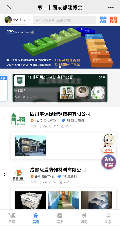 隨著信息技術的發展,成都建博會將線上線下雙線并舉的思路為引領,目前全新打造的大家居建裝產品對接加盟云平臺——“成都建博會線上展會”已上線,平臺可滿足行業商家網上推廣、新品發布、商家宣傳、發布供需信息、線上展覽、商貿配對、客戶約見等訴求,實現線上展會海量曝光蓄客,線下展臺人氣爆棚,打造中西部家居建材行業首個線上+線下高效務實的貿易展會平臺。