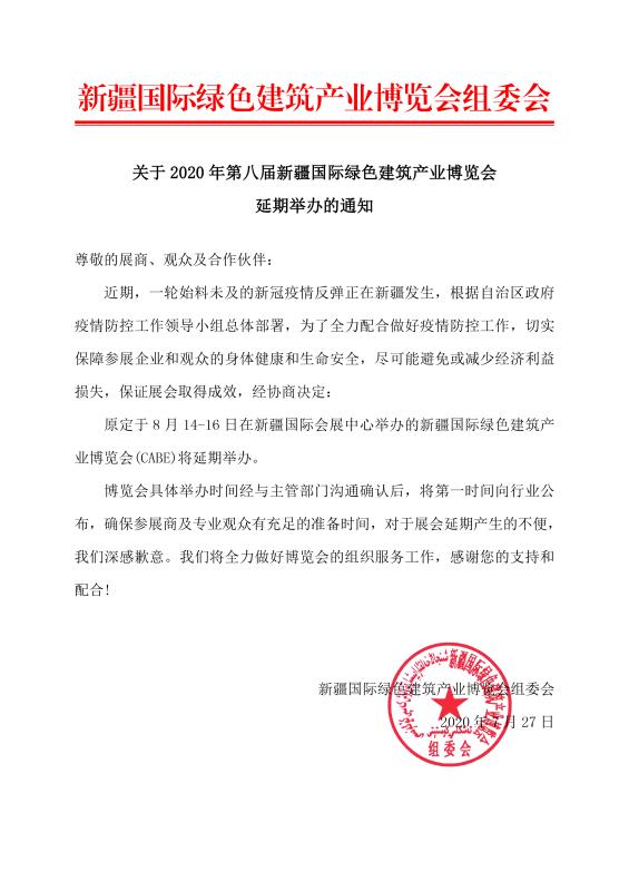 2020第八屆新疆國際綠色建筑產業博覽會延期舉辦通知