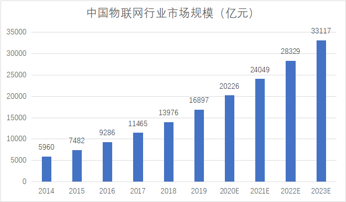 據沙利文數據顯示,中國物聯網行業市場規模在2019年達到了16897億元,過去5年的復合增長率 23.17%。