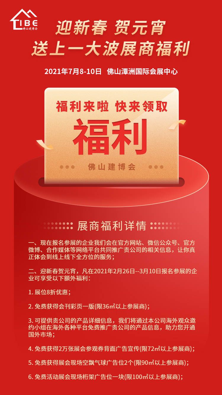 由中國建筑材料流通協會主辦、佛山勵博會展有限公司承辦的第三屆中國(佛山)國際建筑裝材料博覽會為了感謝新老客戶對我們的展會支持,借新春元宵佳節到來之時為廣大參展商送上一波福利: