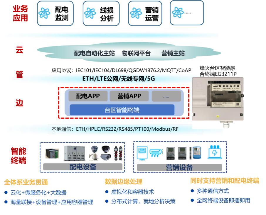 當前,為解決低壓配電網中長期存在配電臺區狀態感知難、線路運維效率低、用戶需求側管理混亂的痛點,烽火積極跟進國網需求,按照智慧電力物聯網“云-管-邊-端”的整體架構,推出臺區智能終端產品,即定位為配電自動化邊緣側設備。遠程上主要通過以太網或廣域無線網絡連接到物聯管理平臺、營銷主站、配電自動化主站或其他業務系統;本地則通過無線通信網絡、有線網絡支持各協議類型、各業務終端和傳感器的即插、即連、即用,實現感知層的通信匯聚、邊緣計算和區域自治。