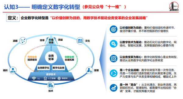 中石化集團最終給數字化轉型下的定義是“以價值創新為目的,用數字技術驅動業務變革的企業發展戰略”。
