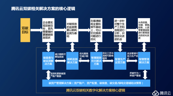 利用技術能力解決行業問題,是騰訊的拿手絕活,騰訊云在雙碳相關解決方案有一套自己的核心邏輯,通過分析企業的雙碳目標,將碳作為一種資產進行管理,通過一套完備的數字化解決方案介入到雙碳的全流程周期中,幫助企業統一串聯,高效管理。