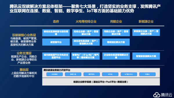 騰訊云雙碳解決方案總體框架——聚焦七大場景,打造堅實的業務支撐,發揮騰訊產業互聯網在連接、數據、智能、數字孿生、IoT 等方面的基礎能力優勢。