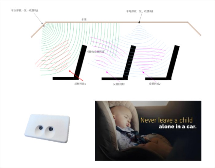 為有效探測車內活動物體,兒童遺忘系統超聲波探測器裝于車頂部,當鎖車后觸發開始工作,向下發送40KHz超聲波(對人體無害)。當有活動物體經過工作區域將會造成探測物體距離發生變化,亦即超聲波回波發生變化,從而判定車內存在活動的物體,繼而觸發報警。