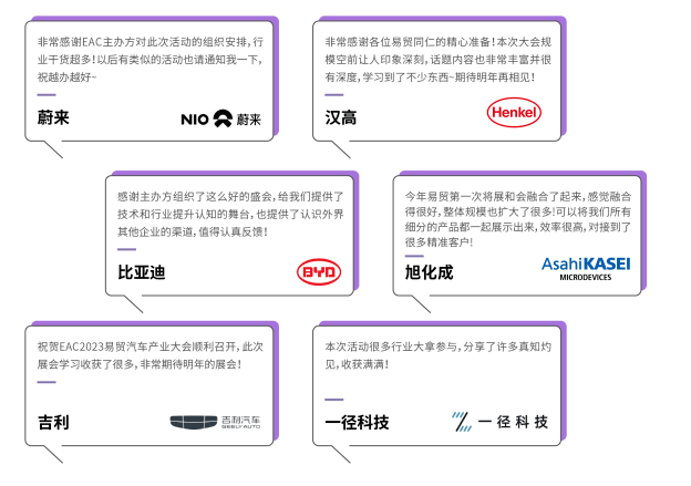EAC聚焦新能源&智能化所帶來的產(chǎn)業(yè)變量,致力于打造最具技術(shù)落地及商業(yè)價值的汽車行業(yè)交流合作平臺。從原材料、零部件供應(yīng)商、系統(tǒng)集成商、生產(chǎn)工藝及設(shè)備供應(yīng)商、仿真及測試到主機廠,覆蓋全產(chǎn)業(yè)鏈。易貿(mào)汽車提供專業(yè)的線下技術(shù)探討互動平臺,并在EAC現(xiàn)場呈現(xiàn)新能源&智能化所帶來的的最新技術(shù)、方案、產(chǎn)品展示,為EAC參與者了解前瞻技術(shù)、發(fā)覺創(chuàng)新方案、優(yōu)化供應(yīng)鏈提供獨特的視角與豐富的資源。EAC2024易貿(mào)汽車產(chǎn)業(yè)大會將攜手新能源汽車、智能汽車等上下游產(chǎn)業(yè)鏈企業(yè),在蘇州國際博覽中心再度強勢升級歸來!加入我們吧!一起來點亮這個汽車研發(fā)及前裝市場最燃的現(xiàn)場吧!