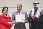 阿布扎比王儲(chǔ)兼阿聯(lián)酋武裝部隊(duì)副總司令Sheikh Mohamed bin Zayed Al Nahyan將軍(右一)和毛里塔尼亞總統(tǒng)穆罕默德·烏爾德·阿卜杜勒·阿齊茲(中間)為Ceres首席執(zhí)行官Mindy Lubber(左一)頒發(fā)2013年“扎耶德未來(lái)能源獎(jiǎng)”非政府組織類獎(jiǎng)項(xiàng)(照片:美國(guó)商業(yè)資訊) |