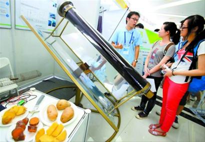 今年,東道主上海交大有13支隊伍晉級決賽,在各高校中最多。在似火驕陽下,機械與動力工程學院的5名本科生設計的太陽能“冷熱機”采用槽式太陽能集熱器,結合計算機編程,通過傳感器測得光伏電壓以及食物種類、規格及重量,從中預知燒烤時間,智能控制燒烤火候。太陽能烤爐還能“逆向操作”,用作熱源加熱吸附床,進行吸附式制冰。在社會實踐類作品中,參賽者將目光投向城市節能評價體系、報廢電子產品回收、餐廚廢棄物處置等問題。