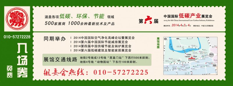 于2014年4月2日-2014年4月4日在北京展覽館舉辦2014第六屆中國國際低碳產(chǎn)業(yè)博覽會,500家展商,15000平方米,觀眾規(guī)模:4萬人次。展品范圍:節(jié)能減排 、建筑節(jié)能及智能家居 、供暖節(jié)能及鍋爐 、資源回收利用等。
