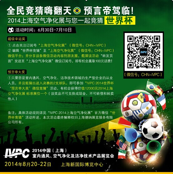 世界杯期間,我們IVPC 2014上海空氣凈化展 推出世界杯“預言帝大獎”競猜活動,只要您是室內通風、空氣凈化、潔凈技術領域的生產型企業的從業人員,并且能猜出進入決賽的2支球隊,即可獲得抽獎資格。