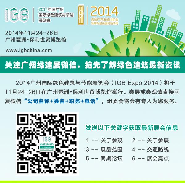 什么樣的建材才是靠譜的節能材料,什么樣的建筑設計才是最節能2014廣州國際綠色建筑與節能展覽會(英文簡稱:IGB Expo 2014)將于1124-26日在廣州琶洲•保利世貿博覽館隆重舉行。各種最先進的綠色建材和技術在這里逐一展示,專業觀眾、市民大眾只需提前關注展會公眾平臺(微信號:igbexpo)并進行預登記,便可快速入場,免費參觀。