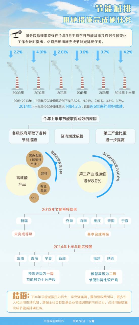 根據國務院辦公廳5月印發《2014-2015年節能減排低碳發展行動方案》,今年2014-2015年,單位GDP能耗、化學需氧量、二氧化硫、氨氮、氮氧化物排放量分別逐年下降3.9%、2%、2%、2%、5%以上,單位GDP二氧化碳排放量兩年分別下降4%、3.5%以上。