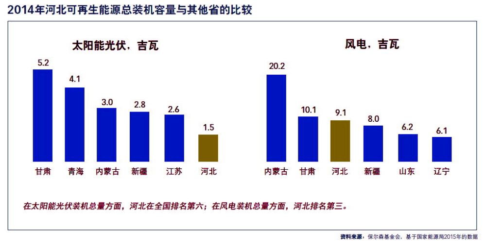 從能源構(gòu)成來(lái)看,河北省嚴(yán)重依賴(lài)化石燃料,90%的電力源自燃煤發(fā)電,煤炭、玻璃和冶金行業(yè)幾乎都以煤炭為唯一燃料。可再生能源在河北省的能源構(gòu)成中只占很小一部分。河北省到2015年的風(fēng)電裝機(jī)容量只有9吉瓦,而到2015年9月,全國(guó)風(fēng)電裝機(jī)總?cè)萘恳呀?jīng)超過(guò)105吉瓦。