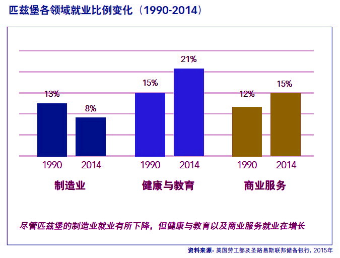 匹茲堡各領(lǐng)域就業(yè)比例變化(1990-2014)