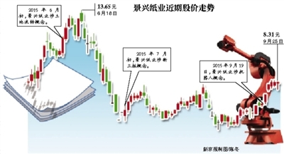 此次高調介入機器人概念是景興紙業的最新籌碼,卻并非手中的唯一籌碼。在此之前,這家老本行乏善可陳的公司,先后因“IPO影子公司概念”、“國企改革”和“土地流轉”等概念,在不同階段成為一時風頭無兩的A股明星。