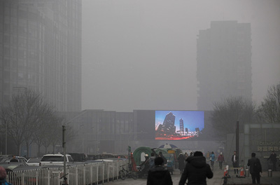 12月1日,北京遭遇嚴重霧霾天氣,國貿地區一塊廣告牌上藍天分外惹眼。