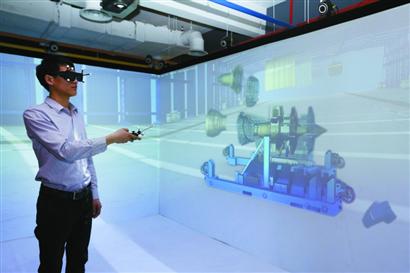 在位于虹橋國際商務廣場的曼恒數字總部,有一大片體驗區,放置著多套展示樣品。在一塊LED大屏幕前,記者戴上3D眼鏡,手握一個手柄,映入眼簾的是一臺航空發動機。它的大小和真實的航空發動機一樣,但輕便得多。借助手柄,你能將它360°翻轉,從各個角度觀察它,還可以將它的零部件一個個拆下來,進行測量、剖切和組裝。每個零部件都根據真實的設計仿真展示,一目了然。通過維修性、測試性仿真,這套飛機發動機虛擬裝配系統能讓研發人員發現設計中的缺陷,及時調整。
