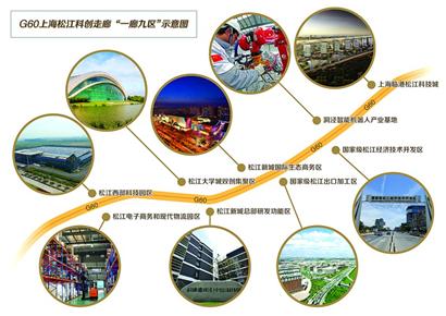 由東北向西南,自九亭到新浜,全長40公里,橫貫松江全境的G60高速公路,是松江的經濟線、發展軸,其沿線集中了松江產業及城市發展所依托的主要空間和創新要素資源。猶如一條錦帶,G60高速串起了全市率先建成的郊區新城、全國規模最大的大學城、上海面積最大的國家級經濟技術開發區、出口規模最大的國家級出口加工區。在這里,沿線產業園區貢獻了松江90%以上的工業產值,集中了松江60%的規模以上企業,集聚了40多家世界500強企業,15個國家和省部級重點實驗室、研究中心,以及100多個市區兩級工程技術研究中心、企業技術中心。