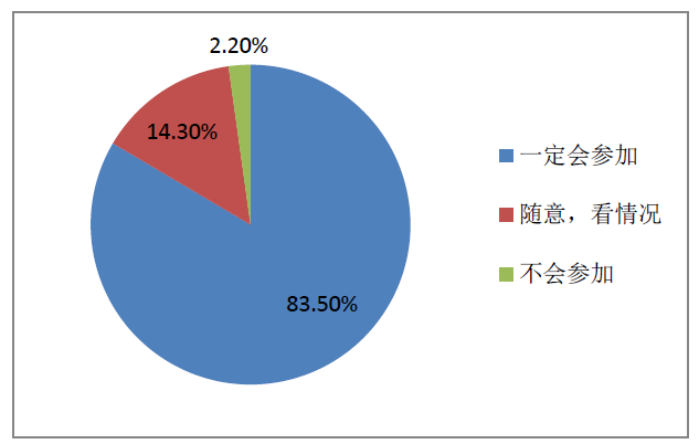 ?。?)、忠誠度:超過八成的參展商愿意繼續參展下一屆高交會。從參展商是否愿意繼續參加下屆高交會的情況來看,83.50%的參展商會參展下一屆高交會,14.29%的參展商不確定是否會參加下一屆高交會;僅2.20%的參展商可能不會參展下屆展會。