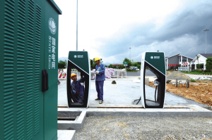7月22日,余杭區(qū)供電公司工作人員來到杭長(zhǎng)高速?gòu)缴椒?wù)區(qū)內(nèi),為即將投運(yùn)的首批高速公路服務(wù)區(qū)電動(dòng)汽車充電樁進(jìn)行調(diào)試。在這里,一座雙向各配備4樁快充充電樁的高速充電站即將完工。此套設(shè)施設(shè)置了兩個(gè)120千瓦充電機(jī)、4個(gè)直流充電樁。建成后,每個(gè)充電樁為一輛最高續(xù)航里程300公里的電動(dòng)汽車充滿一次電只需要30至60分鐘,消費(fèi)金額不到80元。