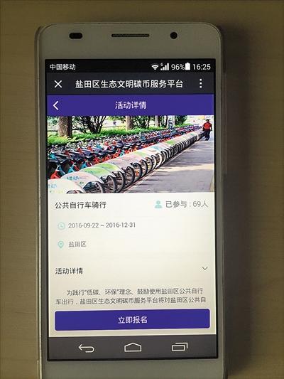 租騎公共自行車、分類投放垃圾、參加生態文明公益活動等綠色低碳行為,均可通過碳幣服務平臺確認而獲得碳幣。而碳幣可以在公眾號或APP上兌換商品優惠、景區門票和手機話費。28日,國內首個碳幣交易平臺在深圳鹽田區上線。該平臺還綁定了家庭的水、電、煤氣系統,每月節約用量可被記錄轉換為減排量,從而換算成碳幣獎勵。