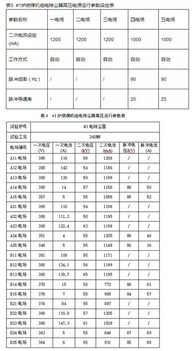 #1爐燃煤機組在鍋爐負荷260MW的運行工況下,電除塵器低壓設備運行正常,電場高壓設備運行正常,電除塵器兩個室的五個電場高壓電源運行參數設定見表3,電除塵器的高壓運行參數見表4。