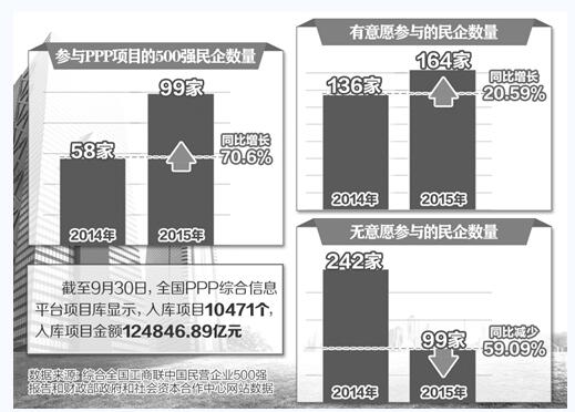 賴朝暉的看法并非個例。據(jù)全國工商聯(lián)發(fā)布的中國民營企業(yè)500強報告顯示,2015年有99家500強的民營企業(yè)參與了PPP項目,比上年增加41家,增長70.6%。有意愿參與的企業(yè)數(shù)由上年的136家增加到164家,增長了20.59%。