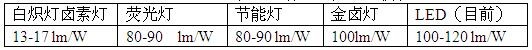 表中的其他各種燈的光效都是不可能再提高的,而LED燈的光效還在每年提高,最近已經(jīng)有200lm/W的LED燈出現(xiàn)了。其光效要比所謂的“節(jié)能燈”高出一倍以上,LED才是真正的節(jié)能燈!