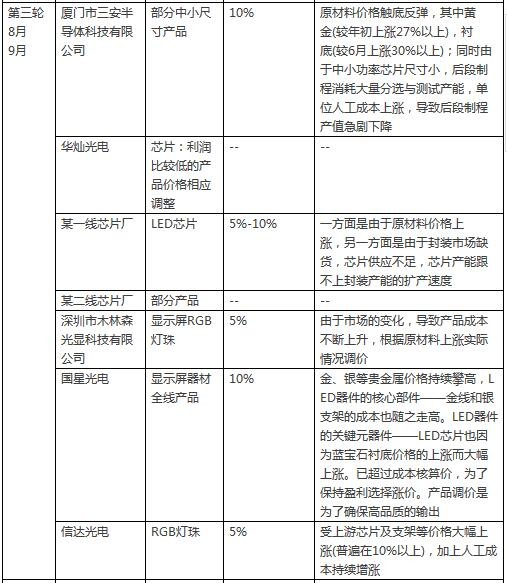 先來看一下原材料漲價的基本情況,根據相關媒體的報道,原材料漲勢兇猛。在競爭激烈、價格廝殺兇猛的LED微利時代,原輔材料一旦漲價,雪上加霜,利潤一壓再壓,哪家企業又能扛得住?于是,LED上中下游也開始做出響應。
