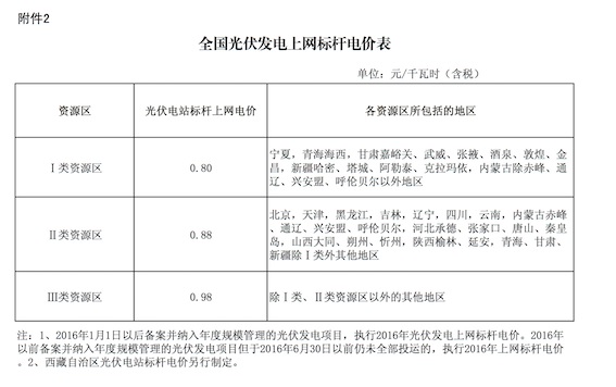 2016年光伏標(biāo)桿上網(wǎng)電價(jià)