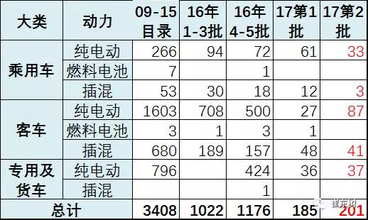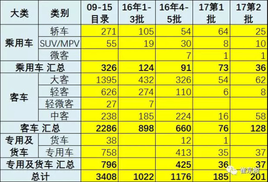 車型目錄的延續性較第一批減弱,16年最后兩批中很多車型成為17年第1批主力。但第二批的201款中有135款是新申報的新能源車