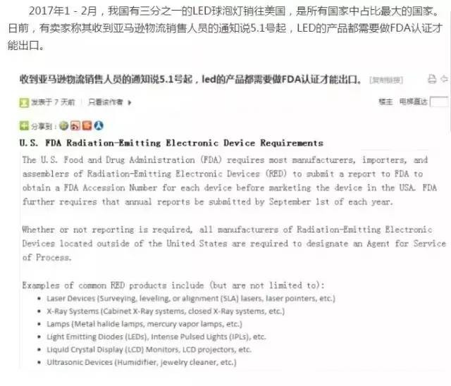 經(jīng)查實,該消息最早源自亞馬遜的一篇文章,文章大意如下:近期亞馬遜下架了一大批LED燈,并且通知買家,在5.1號起,LED產(chǎn)品都要做FDA認證才能出口。