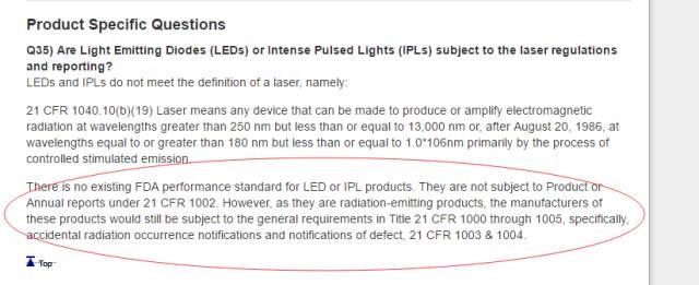 注意紅圈里的內(nèi)容,F(xiàn)DA說目前沒有針對LED或IPL產(chǎn)品的性能標準,但是它們?nèi)匀皇艿?1 CFR 1000-1005的一般性要求的限制。至于21 CFR 1000-1005是什么標準,通常來說你的產(chǎn)品只要不是強輻射類的(比如X光或者紫外光、激光等),都基本能滿足這些要求。