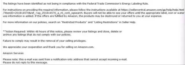 第一句話就很明白了,產(chǎn)品不符合聯(lián)邦貿(mào)易委員會(FTC)能源標簽標準的規(guī)定。