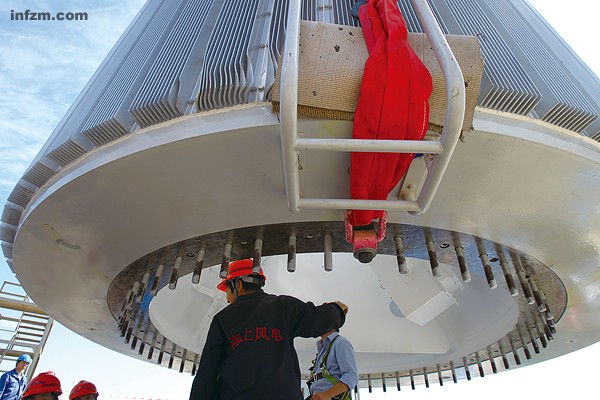 2010年9月30日,江蘇科瑞鑫海上風(fēng)電工程公司技術(shù)人員在啟東進(jìn)行風(fēng)電永磁發(fā)電機(jī)吊裝。 (CFP/圖)