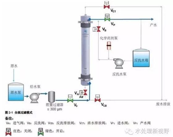 超濾可以按照全流或死端過濾(Dead-end)、錯流過濾(Cross-flow)和濃水排放過濾(Concentrate Bleed)三種運行模式操作。