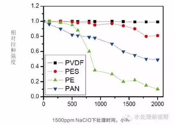 聚偏氟乙烯(PVDF)材質的化學穩定性最為優異,耐受氧化劑(次氯酸鈉等)的能力是聚醚砜、聚砜等材料的10倍以上。在水處理中,微生物和有機物污染往往是造成超濾不可逆污堵的主要原因,而氧化劑清洗是恢復通量最有效的手段,此時聚偏氟乙烯(PVDF)材質體現出了其優越性。