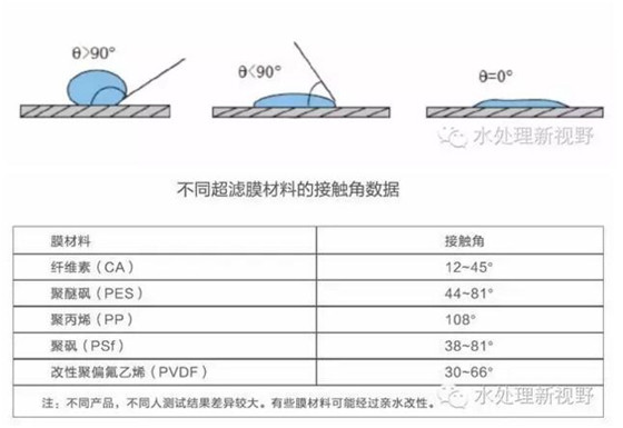 一般認為,親水性好的膜材料就不容易被污堵,污堵后也容易清洗恢復。親水性往往采用接觸角來衡量。