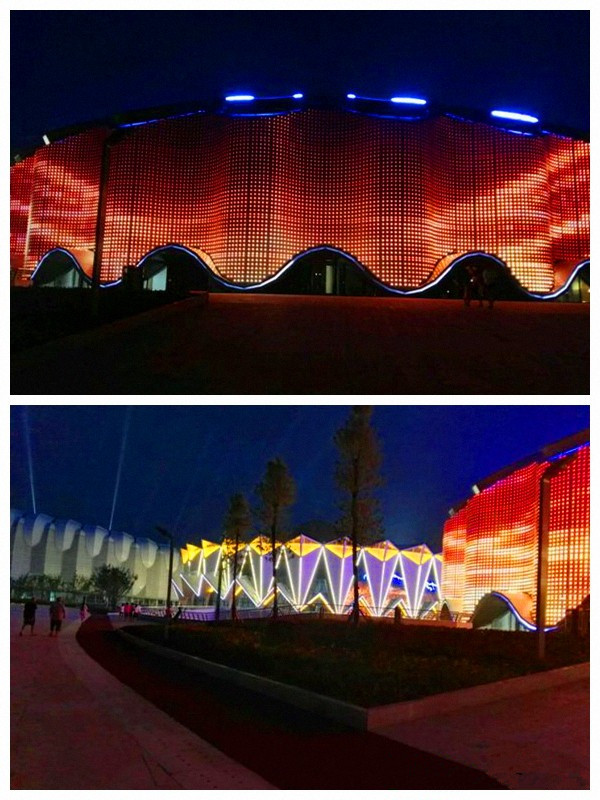 “一場兩館” 外墻就是一個(gè)調(diào)色板,一會(huì)兒紅,一會(huì)兒藍(lán),一會(huì)兒黃。此時(shí),主場館就是一塊大屏幕,各種符號在屏幕上“跳躍”。突然,一幅幅動(dòng)畫出現(xiàn)在屏幕上,有奔跑的藍(lán)天白云,有運(yùn)動(dòng)的健兒,五星紅旗在空中迎風(fēng)飄揚(yáng)……