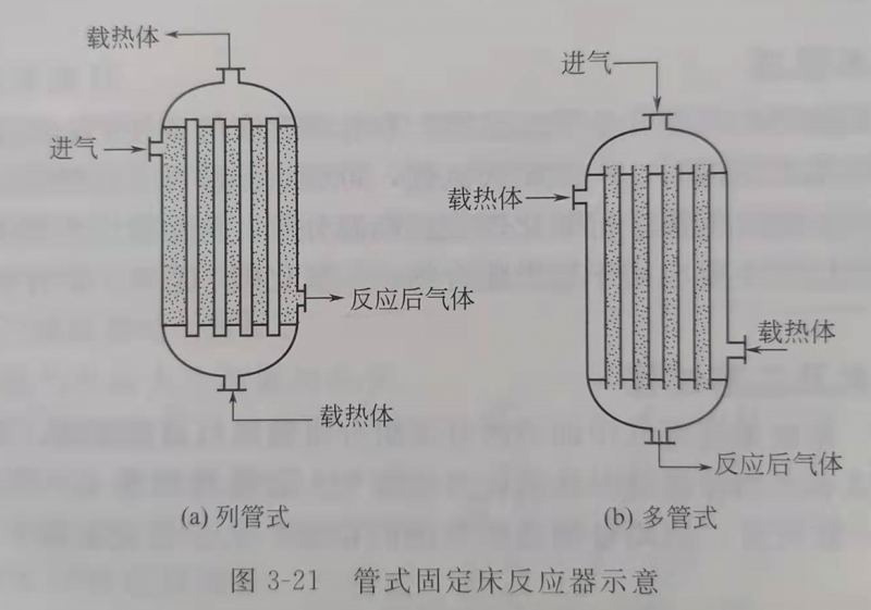 (1) 管式反應器  該種反應器結構示意如圖3-21所示,有多管式與列管式之分。在多管式反應器中,催化劑裝填在管內,換熱流體在管間流動;列管式的催化劑裝在管間,換熱流體則在管內流動。列管式反應器由于催化劑裝卸不便而很少應用。