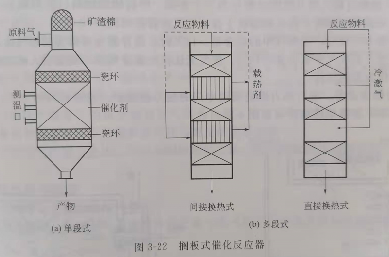 (2)擱板式反應器   擱板式反應器的結構示意如圖3-22所示。擱板式反應器屬于絕熱式反應器,反應床層與外界環境基本上無熱量交換。多段式反應器就是在催化劑層之間設置換熱裝置,以利于反應熱的移出。